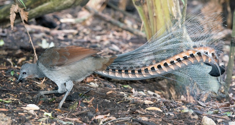 You can identify a lyrebird by its impressive tails. Males have around 8 ornate feathers that feature beautiful, neutral designs. As you’ll learn later on, these are used for their courtship displays.